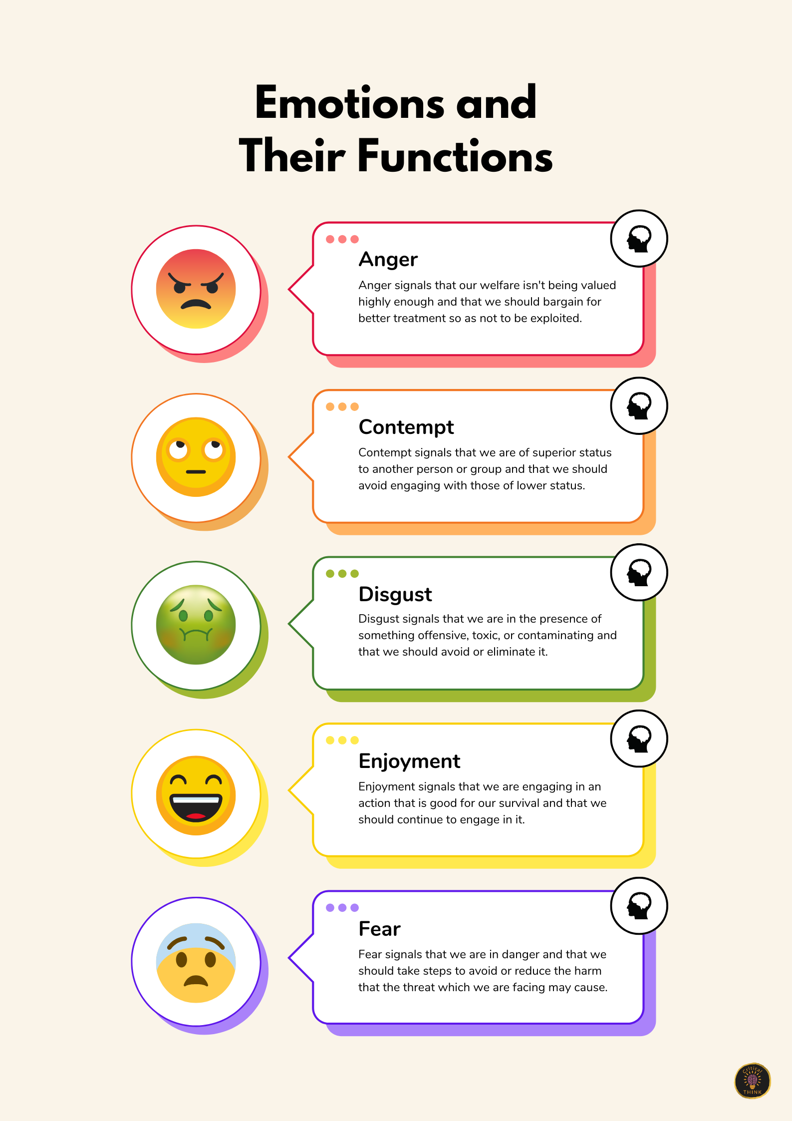 The purpose of this tool is to help people identify the emotions they are experiencing and expand their emotional vocabulary. This tool covers the seven universal emotions: anger, contempt, disgust, enjoyment, fear, sadness, and surprise. For each of the seven emotions, a list of related emotions is provided, along with examples of physical sensations and behaviours that accompany the emotion.