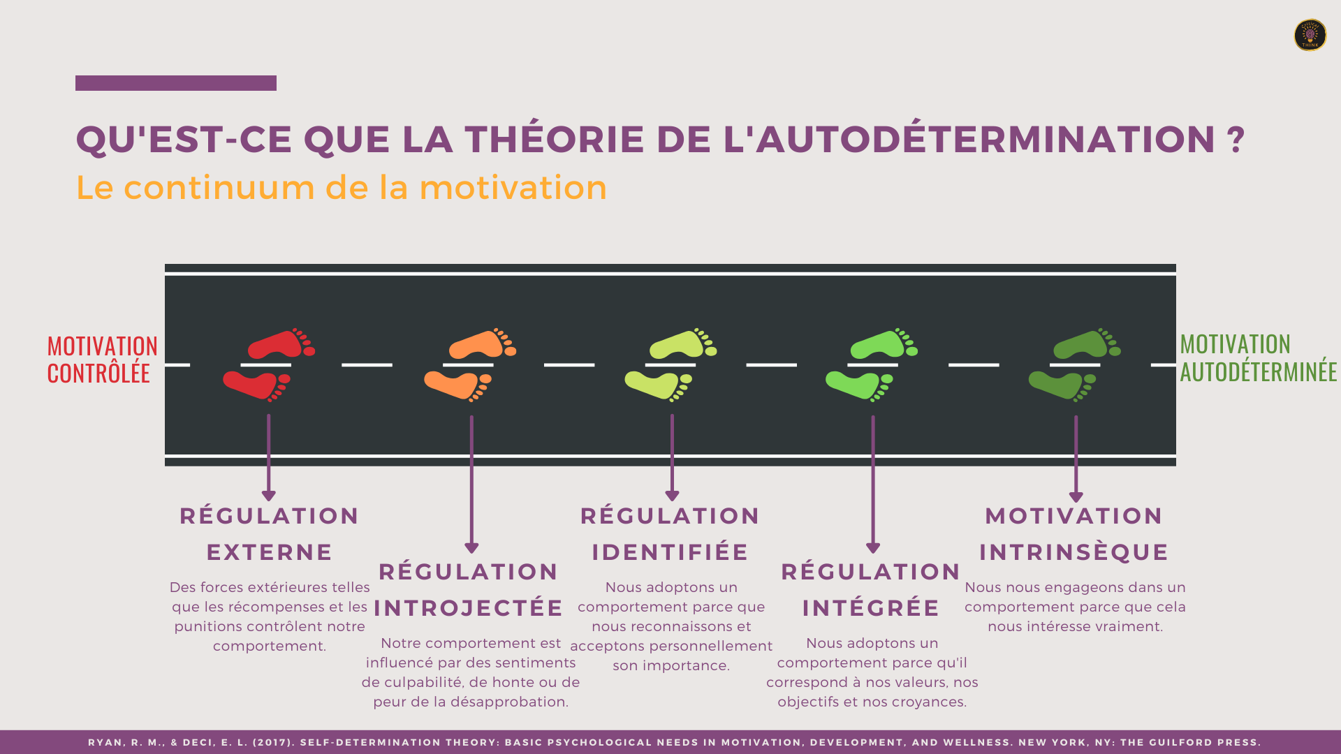 Cet outil offre une représentation simplifiée du continuum de motivation tel que défini par la théorie de l'autodétermination. Il peut être utile pour enseigner cette théorie ou pour rappeler les différents types de motivation que nous pouvons ressentir.