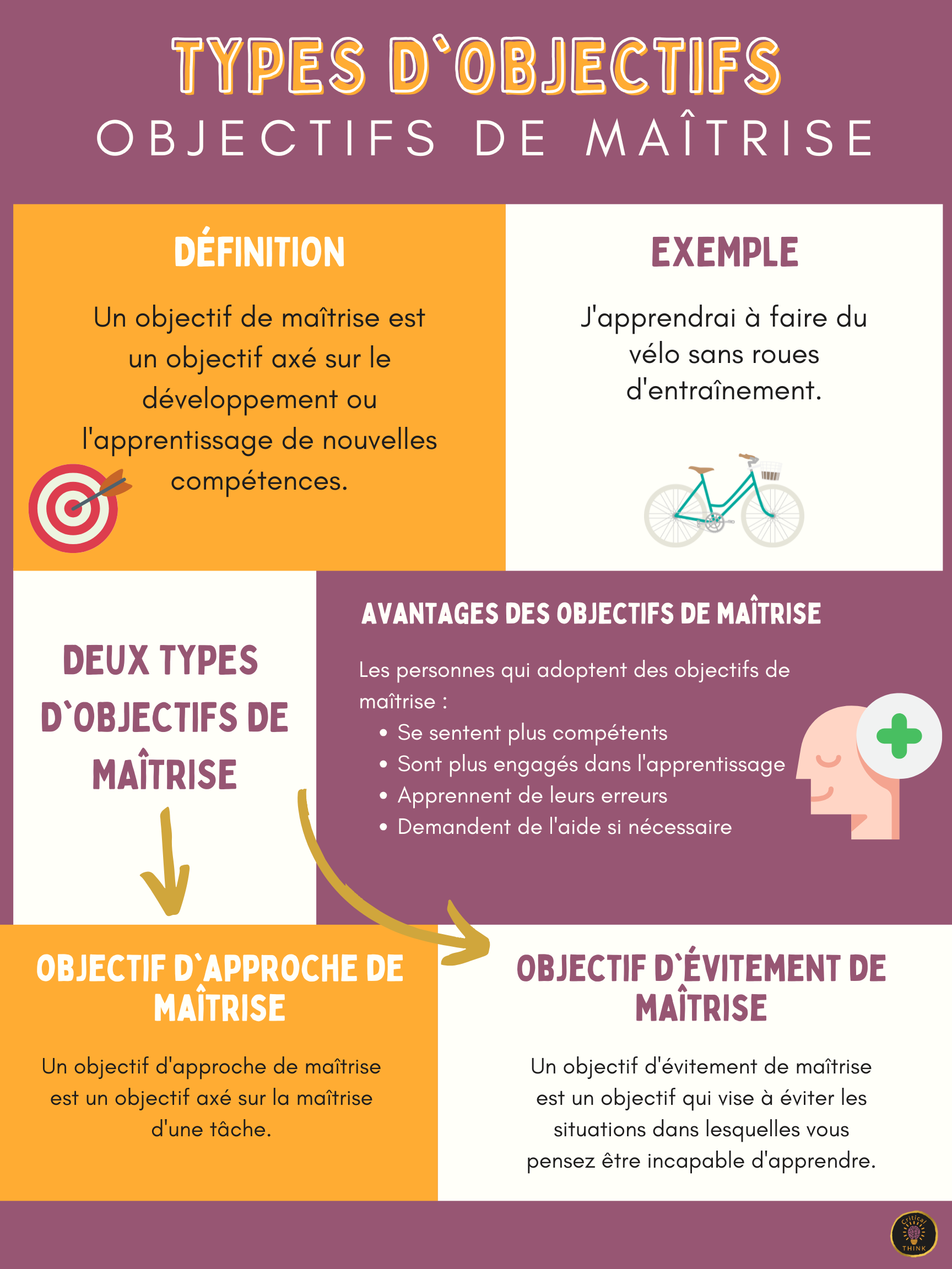 Cet outil vise à résumer les différences entre les objectifs de maîtrise et les objectifs de performance. Il peut être utilisé en classe pour aider les élèves à se concentrer sur la maîtrise de nouveaux concepts, en entreprise pour aider les employés à prioriser le développement de leurs compétences, et dans le monde du sport pour aider les athlètes à perfectionner leurs compétences.