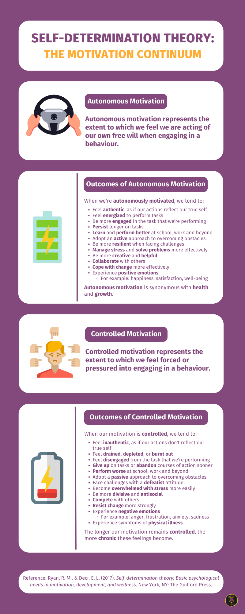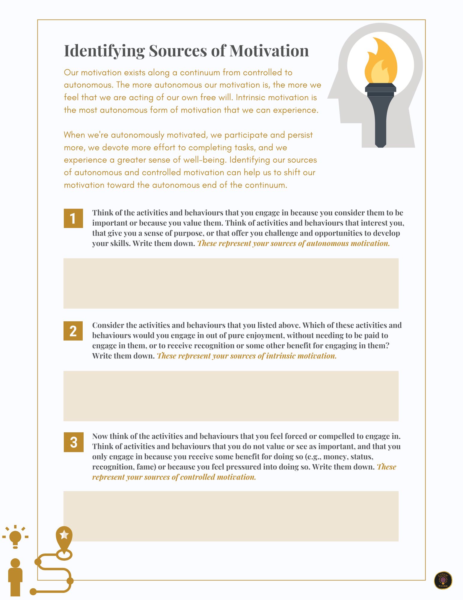 Our motivation exists along a continuum from controlled to autonomous. The more autonomous our motivation is, the more we feel that we are acting of our own free will. The purpose of this tool is to help you identify your sources of autonomous and controlled motivation so that you can shift your motivation in a positive direction.
